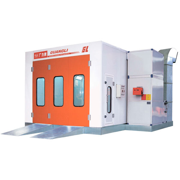Корпус Guangli GL2 собирается из сэндвич-панелей толщиной 50 мм, в качестве наполнителя используется пенополистирол, опционально можно в качестве наполнителя использовать минеральную вату. Фронтальная дверь окрасочно-сушильной камеры состоит из 3-х створок, аварийная дверь находится сбоку камеры, она оборудована пневматическим затвором. Окрасочно-сушильная камера Guangli GL2 оборудована двумя вентиляторами: приточным и вытяжным (особенность комплектации). Наличие двух вентиляторов позволяет увеличить воздухообмен внутри камеры до 24 000 м³/час. Приточный вентилятор обладает мощностью 5.5 кВт, мощность вытяжного вентилятора составляет 4 кВт. Заслонка, переключающая режимы окраска/сушка, срабатывает автоматически посредством пневматики. Система фильтров состоит из: потолочного фильтра (степень фильтрации 98%), напольного фильтра (степень фильтрации 95%) и фильтра предварительной очистки (степень фильтрации 80%). Потолочный фильтр окрасочно-сушильной камеры состоит из 4-х фильтров, которые монтируются над несущей рамой, выполненной из стали и покрашенной порошковым покрытием. Напольный фильтр состоит из 2-х частей и одного выпускного фильтра. Верхнее освещение состоит из 10 плафонов, каждый плафон состоит из 4 ламп по 40 Вт. Блок управления и его компоненты произведены в Китае, они защищены от перегрузки, перегрева и пропадания фазы, мотор с линейным приводом. При истечении заданных значений времени, работа камеры автоматически прекращается. Покраска происходит при постоянной температуре. Питание камеры осуществляется посредством трёхфазной сети напряжением 380 В, мощность установки 9.5 кВт.